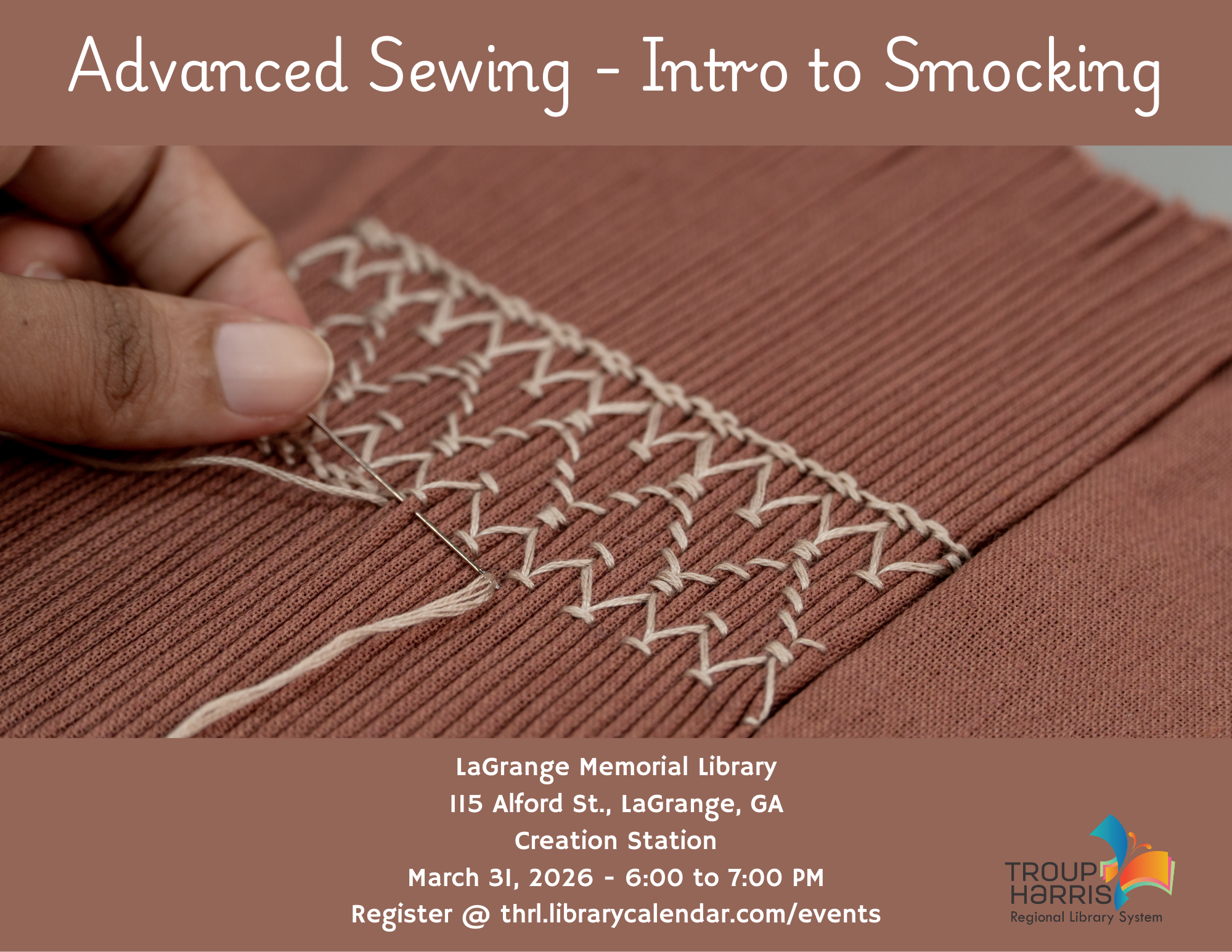 Are you a more advanced sewist? Ready to make those beautiful little smocked outfits for your children or grandchildren, or just a smocked shirt or tunic for yourself? Come and learn this popular skill that has been passed down through the generations since medieval times. All supplies and patterns provided.