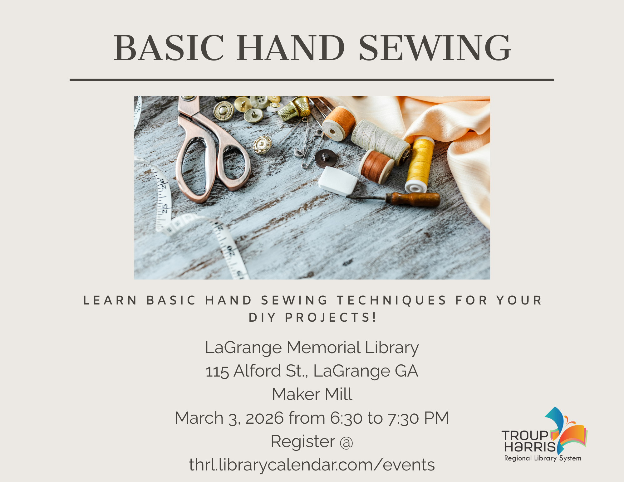 For all patrons who have been excited to begin sewing, this program is a great place to start. We will introduce five basic hand sewing stitches for use in mending and sewing. You will be able to hem, and sew basic garments and household items by hand. Then you can come back next time for introduction to the sewing machine! All supplies will be provided.