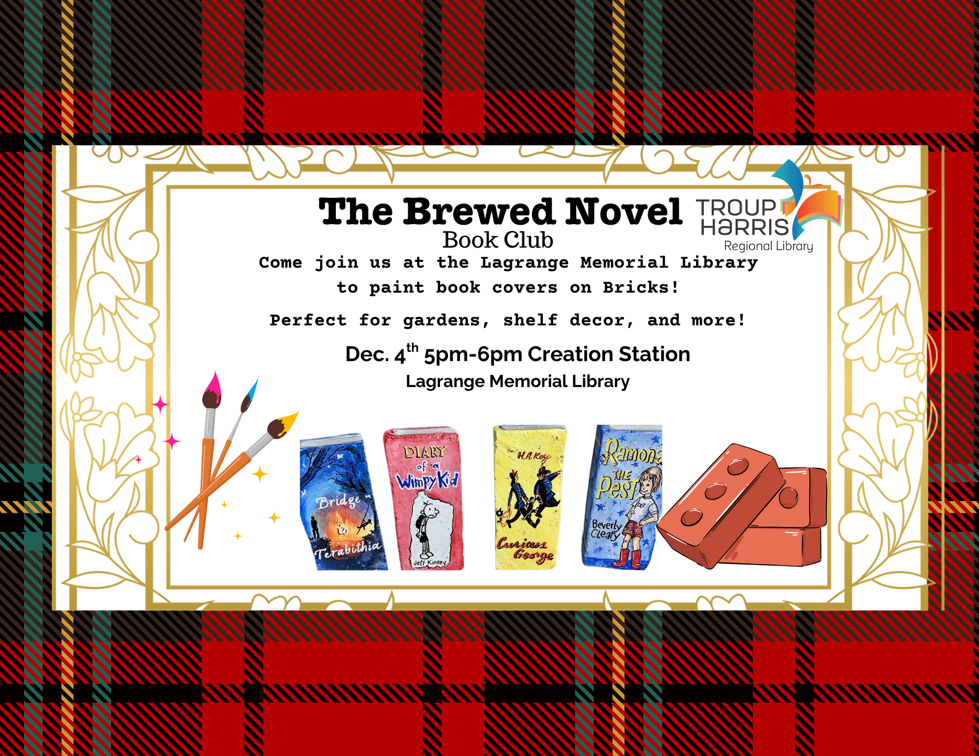 Do you love books? Do you love TALKING about books? The Brewed Novel Book Club is the book club for you! Meet us in the LaGrange Memorial Library's Creation Station on December 4th from 5 PM - 6 PM for some cozy book chats and even a fun craft. This week we'll be painting your favorite book covers on bricks. Tea and coffee provided. This program is free and open to all adult patrons. All supplies will be included, just bring yourself!
