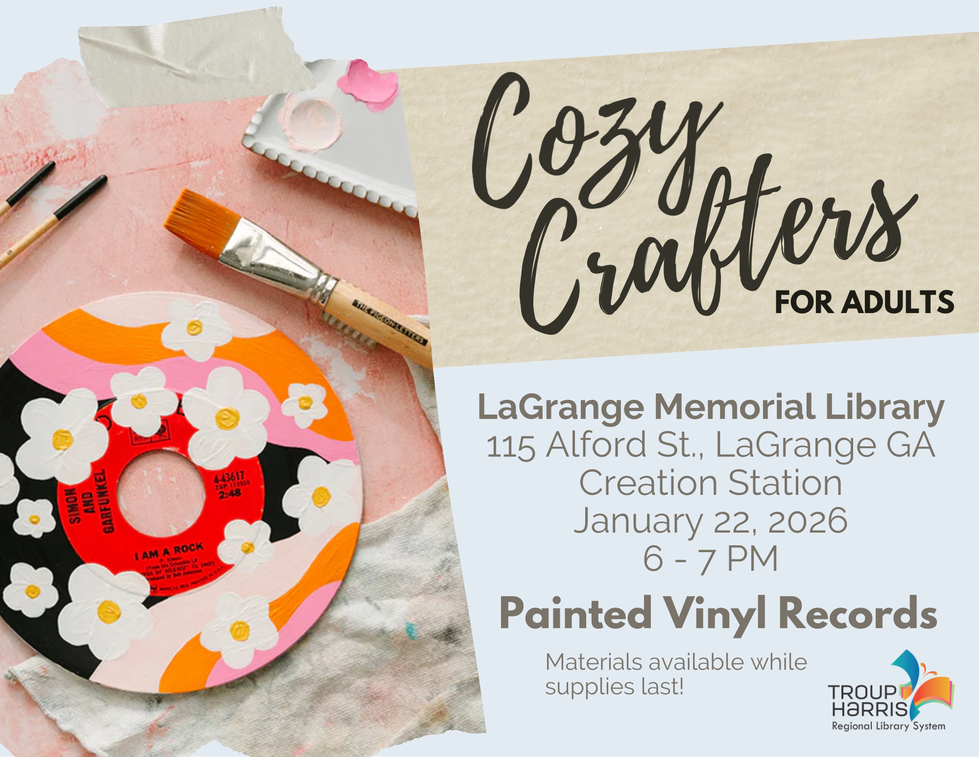 Cozy crafters, unite! This month we're decorating vinyl records. Supplies will be provided, just bring yourself! This program is FREE and available for our adult patrons.