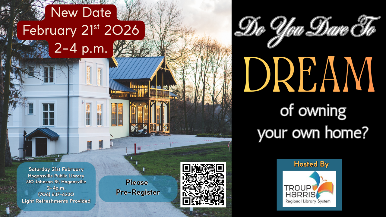 You are invited to Hogansville Public Library to explore all aspects of preparing to purchase a home. Bring your questions. With all the challenges to home ownership, this is a great chance to see what is required now, what to expect, and where you can get help wadding through the paperwork. You will hear from three different specialists who deal with finding a home with you, getting through the loan application process and checking the legal ownership of the property. First time home buyers will especially benefit from the information.