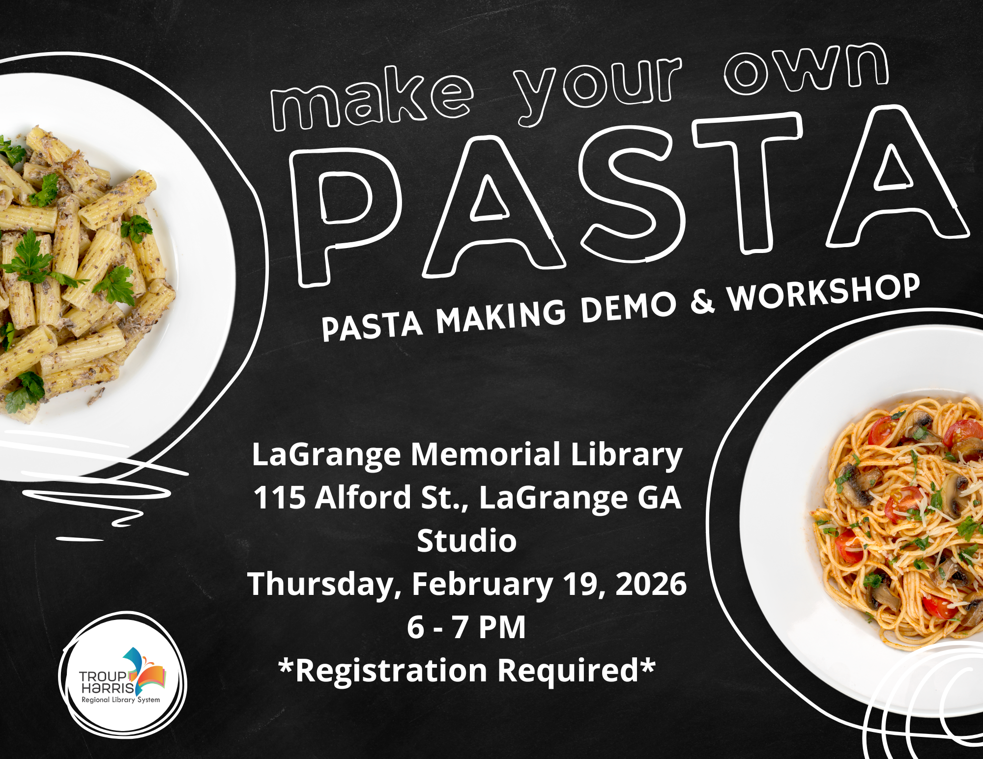 Have you ever wanted to make your own pasta? Well, you're in luck! Come ready to get your hands in the dough and make your own pasta. We will also enjoy a nice pasta meal after learning to make the noodles by hand. Registration required.