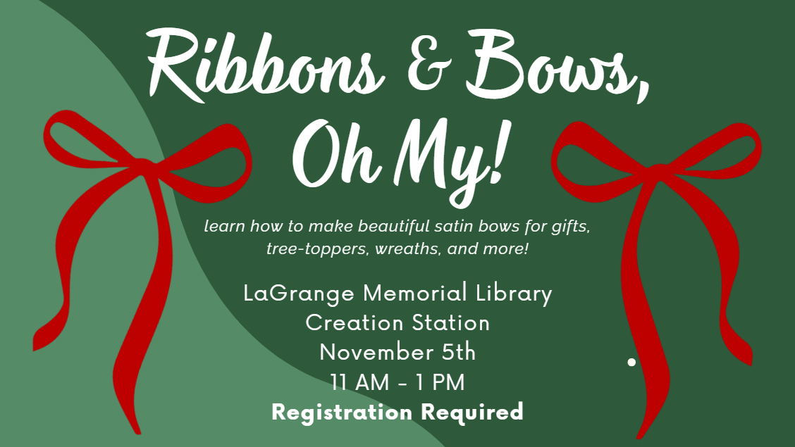 Ribbons and bows, oh my! Learn how to make oh-so lovely bows and ribbons for your holiday gifts, wreaths, tree-toppers, or anything you want to stick a bow on! This fun program is free for our adult patrons. Registration is required as seats are limited.