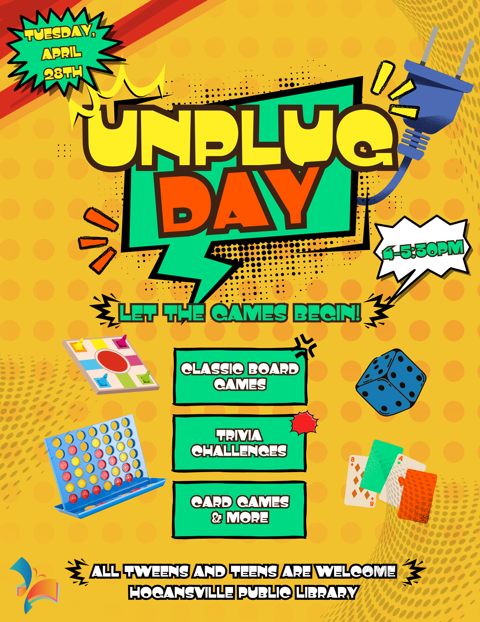 Come by the library and chill. Join us as we unplug from our devices and enjoy an extravaganza of board games, card games, trivia, and more! All tweens and teens are welcome! Join Kenyetta for an fun experience. Bring your ideas about what you would like to do in our teen and tween club in the future!