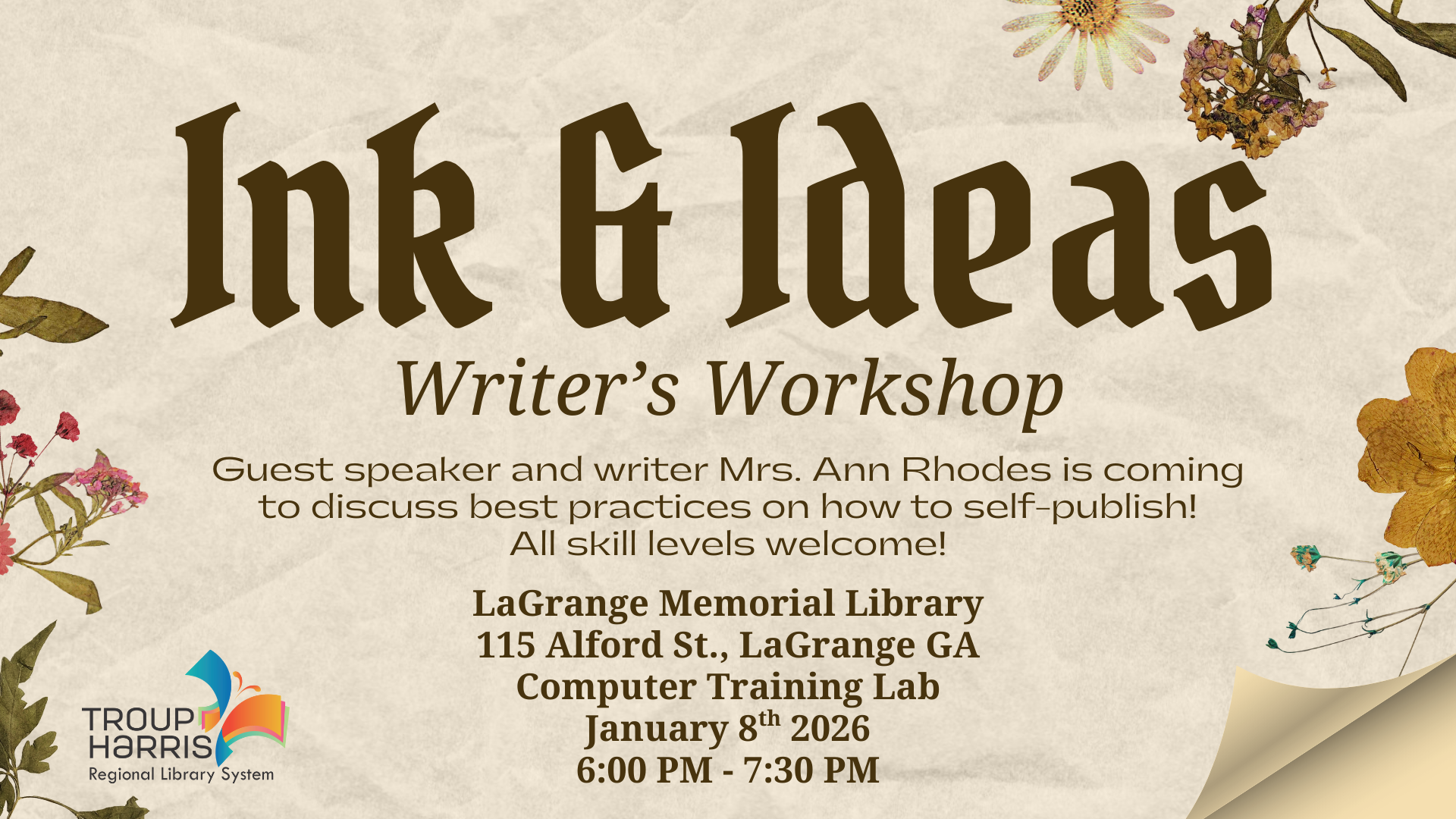 Working on a piece of writing and want to see what others think? Join us at the LaGrange Memorial Library for Ink & Ideas, a new writer's workshop! Bring your latest WIP to discuss, try your hand at some writing prompts and challenges, and get feedback on your work! For our first session, we have guest author Ann Rhodes visiting to discuss the self publishing process.